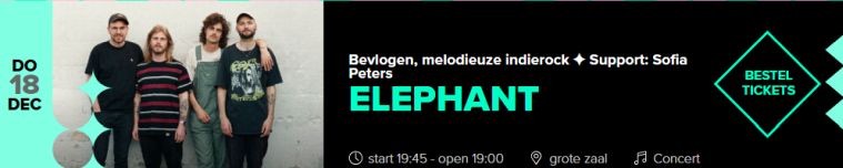 Als afsluiter kan er ook deze week weer iets gewonnen worden. Donderdag 18 december speelt ELEPHANT, één van de leukste indie-bands uit Nederland, in Luxor en voor dat concert verloten we een tweetal gratis entreekaartjes plus een door de band gesigneerde LP!!