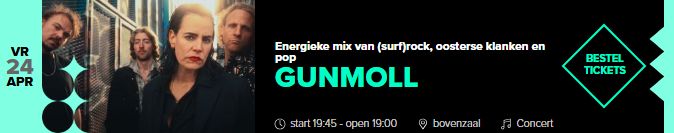 Vrijdag 24 april speelt GUNMOLL in Luxor Live. GUNMOLL maakt een energieke mix van (surf)rock, oosterse klanken en pop. De soort muziek die niet zou misstaan op een soundtrack voor een cultfilm of Tarantino-film.