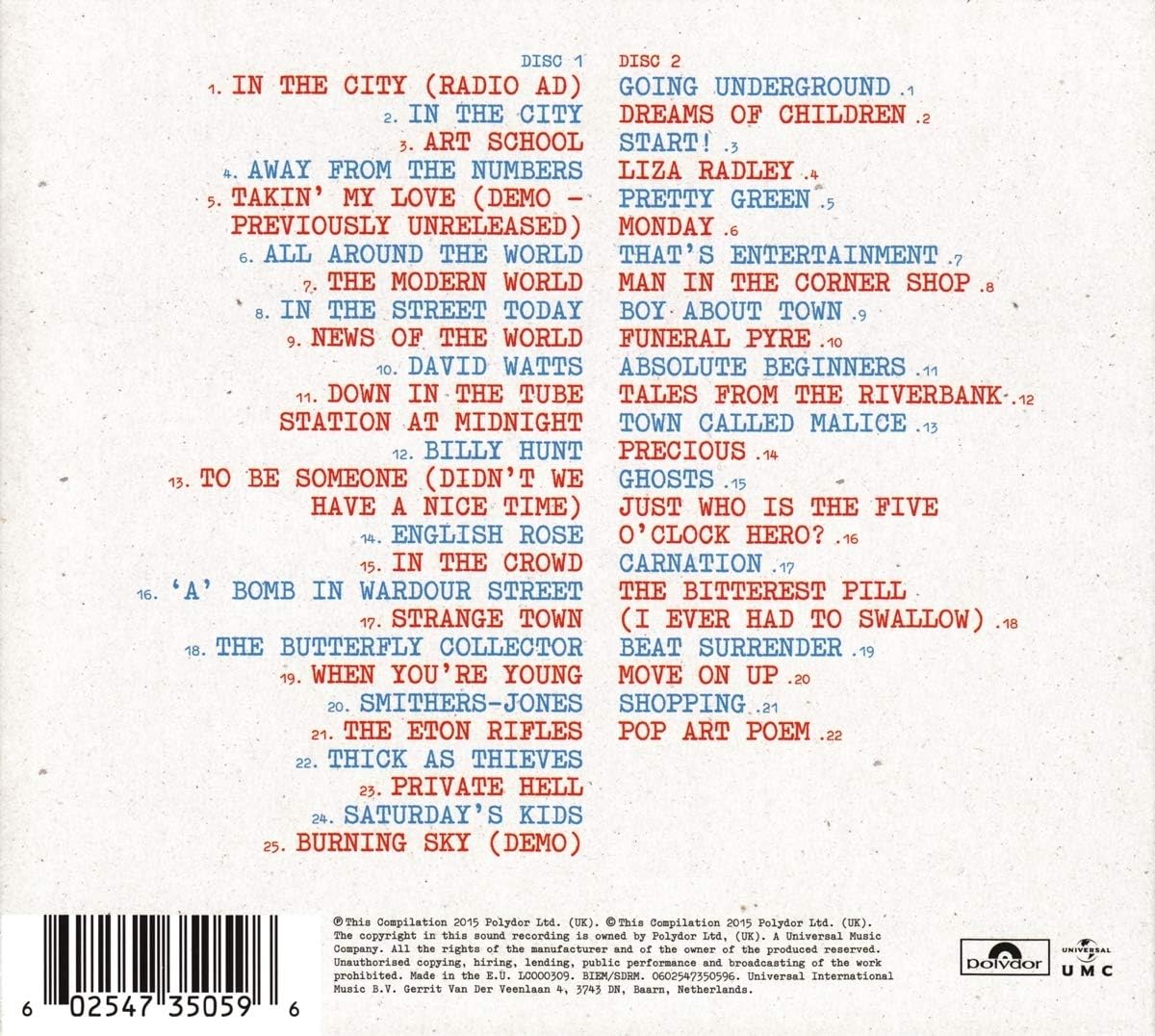 In The CityIn The CityArt SchoolAway From The NumbersTakin' My LoveAll Around The WorldThe Modern WorldIn The Street TodayNews Of The WorldDavid WattsDown In The Tube Station At MidnightBilly HuntTo Be Someone (didn't We Have A Nice Time)English RoseIn The Crowd'a' Bomb In Wardour StreetStrange TownThe Butterfly CollectorWhen You're YoungSmithers-jonesThe Eton RiflesThick As ThievesPrivate HellSaturday's KidsBurning Sky