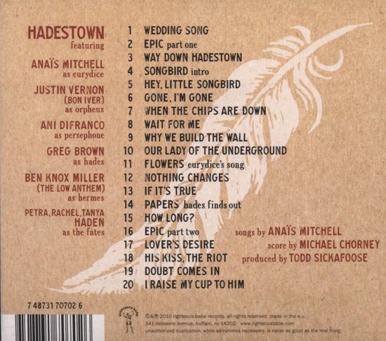 Wedding SongEpic [part One]Way Down HadestownSongbird (intro)Hey, Little SongbirdGone, I'm GoneWhen The Chips Are DownWait For MeWhy We Build The WallOur Lady Of The UndergroundFlowers (eurydice's Song)Nothing ChangesIf It's TruePapers Hades Finds OutHow Long?Epic [part Two]Lover's DesireHis Kiss, The RiotDoubt Comes InI Raise My Cup To Him